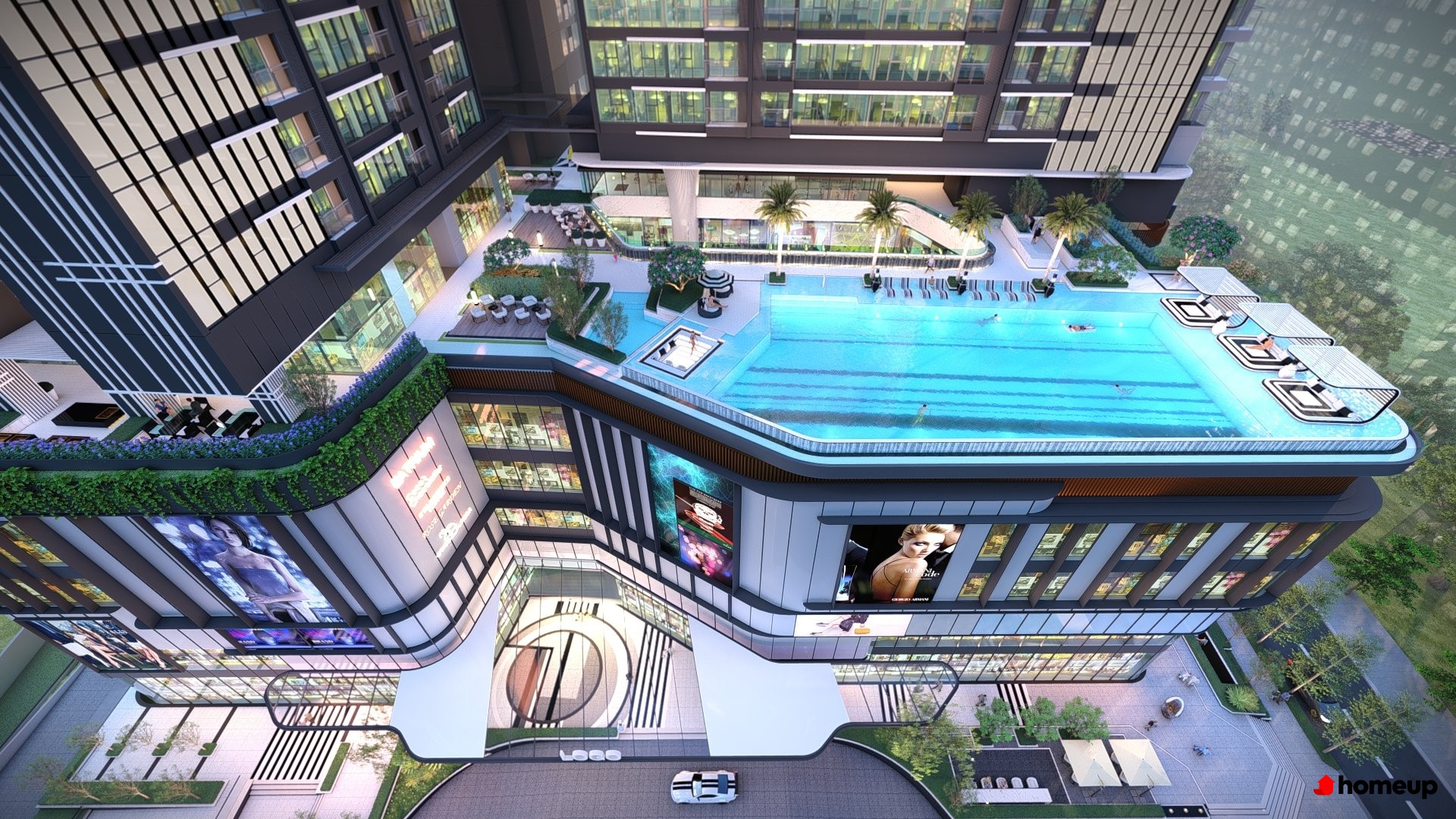 Trung tâm thương mại 5 tầng + 4 tầng hầm được hợp tác theo phong cách kiến trúc Takashimaya, tích hợp mua sắm, ẩm thực, rạp chiếu phim, quán cafe cao cấp và hầm đỗ xe rộng, phục vụ cư dân đỗ xe hằng ngày