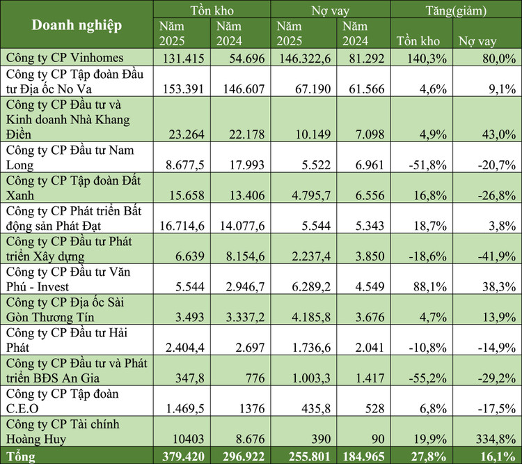 Thống kê cho thấy, tổng nợ vay của nhiều doanh nghiệp bất động sản đã tăng đáng kể. Chỉ riêng nhóm 13 doanh nghiệp bất động sản dân cư, tổng dư nợ đến cuối năm 2025 đã lên tới hơn 255.800 tỷ đồng, tăng hơn 16% so với đầu năm.